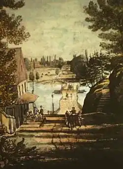 It was still marked as "Lower Ferry" on a 1753 map,[6] but it would soon take the name of its new proprietors, the brothers Robert and George Gray. George (1725–1800) owned large tracts of land near the ferry's eastern landing (in today's Grays Ferry neighborhood of South Philadelphia) and in 1787 would become a signatory to Pennsylvania's ratification of the U.S. Constitution.[3][7]