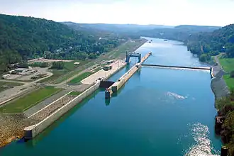 There is one lock chamber on the right descending bank of the river at the dam. The reservoir formed by the dam is also a municipal and industrial water supply. The structure is the third on the site. Originally, an 1880s stone masonry structure sat in this location; it was replaced in 1923 by a modern dam.