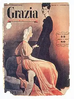 The Italian edition of Grazia was first published by Mondadori in November 1938.[6] Mondadori started the magazine to compete with Lei, a women's magazine published by the Rizzoli company.[7] Grazia was modelled on the American magazine Harper's Bazaar.[8] The start of Grazia was a return in Italy to traditionalist values such as cooking and child-rearing.[9]