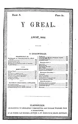 The Greal (Llangollen) was a 19th-century Welsh-language periodical, first published by William Williams in Llangollen in 1852. Its editors included Baptist minister John Jones (Mathetes, 1821-1878), minister Abel Jones Parry (1833-1911) and minister Owen Davies (1840-1929). Its articles were aimed at members of the Baptist Church congregations.[1][2] Many popular Welsh musicians and poets of the 19th Century, such as John Owen published regularly in this popular periodical.[3]