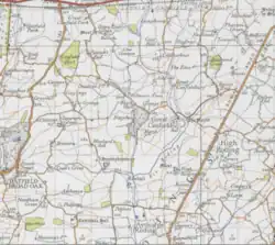 Since 1801, housing levels have changed in line with changing population. During the 1800s, however, this was not the case. Between the years 1831-1881, Great Canfield recorded an increase in the total number of houses from 93 to 104;[7] the population rate during this time decreased. In the 1900s, the number of houses in Great Canfield increased: between 1921-1961, there was an increase in houses from 75 to 123 with consistent increases being reported at every census.[7] The 2001 and 2011 censuses show an increase in the total number of houses within Great Canfield- the 2001 Census registered a total of 133 houses,[8] and the 2011 Census, 156.[9] This may be due to the pressure of increasing urban development within Great Canfield, however, such development remains widely rejected within the Great Canfield community. A scheme of 31 July 2014 proposed major residential development within Great Canfield with the building of a further 211 homes on the land west of Canfield Road.[10] The proposal was refused on the 5 November 2014 by Uttlesford District Council.