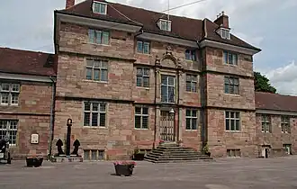 When Worcester was appointed to the post of President of the Council of Wales and the Marches, he decided that he needed a seat in the Marches appropriate to his status. The house was primarily intended to be used for ceremonial and official, rather than domestic, purposes.[2][3] The architect is unknown. The house was built of mottled pink and grey blocks of Old Red Sandstone, probably mostly reused from the gatehouse and Great Tower of the castle, which were wholly or partly demolished after the Civil War; much has been renewed more recently. The remains of the castle stand in the far left-hand side of the courtyard in front of the house.