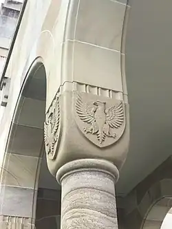 As part of Hennessy, Hennessy & Co's original concept, it was intended that the Great Court would include extensive sculptural work portraying historical panels, statues, coats of arms and panels of Australian plant and animal life. Many of the designs were done by Leo Drinan, who was the principal architect with Hennessy, Hennessy & Co. Work on the sculptures began in 1939, with German born John Theodore Muller and Frederick James McGowan as the principal stonemasons. Work was halted by the war in 1942 and McGowan died before it resumed three years later. Muller continued to carve until one year prior to his death at 80 years of age, in 1953.[3] At the time of his death all of the friezes, most of the statues, and half of the grotesques, coats of arms, arches and roundels were completed.[1]