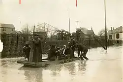 Some of the Dayton flood victims made their way to National Cash Register's factory and headquarters, where John H. Patterson, the company's president, and his factory workers assisted flood victims and relief workers.[15] NCR employees built nearly 300 flat-bottomed rescue boats.[5] Patterson organized rescue teams to save the thousands of people stranded on roofs and the upper stories of buildings.[6] He turned the NCR factory on Stewart Street into an emergency shelter, providing food and lodging. He organized local doctors and nurses to provide medical care.[5] NCR facilities served as the Dayton headquarters for the American Red Cross and Ohio National Guard relief and rescue efforts and provided food and shelter, a hospital and medical personnel, and a makeshift morgue. The company's grounds became a temporary campground for the city's homeless. Patterson also provided news reporters and photographers with food and lodging and access to equipment and communications to file their stories. When the presses of the Dayton Daily News became inoperable due to the floodwaters, the newspaper used NCR's in-house printing press, providing Dayton and NCR with press coverage on AP and UPI newswires.[15]