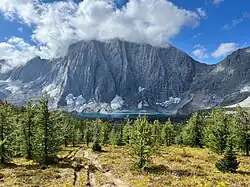 The main route descends to follow the river downstream, while the Perseverance and Loren Lake High Routes remain largely above treeline and rejoin after approximately 44 kilometres (27 mi).[148] Shortly after this junction, the GDT leaves the Jackpine to ascend Big Shale Hill and follow the divide through passes below Mount Talbot, Mount Forget, Mount Morkill, Mount Fetherstonhaugh, and Casket Mountain.[149] A junction with the 66 kilometres (41 mi) Sheep Creek trail to Grande Cache, Alberta provides an alternate route to pavement.[150][140][143]