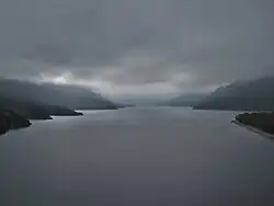 Upper Waterton Lake, at the southern terminus (Section A), is the deepest lake in the Canadian Rockies at 148 metres (486 ft).[40][41] It is a finger lake: glaciers carved its present deep, steep-sided shape out of an ancestral river valley, deposited a dam of debris at the northern end of the valley while retreating, and filled the valley with meltwater.[42][43]