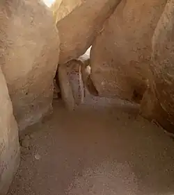 The entrance was marked by a large menhir, decorated with dimples, which is now lying on the ground.[1][2]