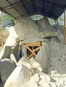 The remaining façades are obstructed by the observation mound, which still covers almost the entire structure except for the eastern side. The polygonal chamber, consisting of seven 8 metre-high pillars, is followed by smaller 2 metre-high slabs forming a 12 metre long (1.5 metre wide) corridor.[1][2] The 7 metre coverage slab (acting as a roof), lies broken on the mound, with a sag on its western edge.[1][2]