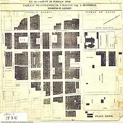The Great Fire of 1852 was a fire in Montreal that began on July 8, 1852, and left as many as 10,000 people homeless (at a time when the city's population was only 57,000) and destroyed almost half of the city's housing. The fire occurred at a time when the city's recently constructed reservoir, located at the site of today's Saint-Louis Square, was drained and closed for repairs. The first fire broke out at a tavern on St. Lawrence Boulevard and spread quickly, fanned by strong winds and hot, dry summer weather.[1][2]