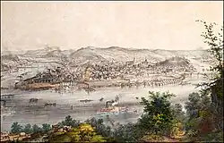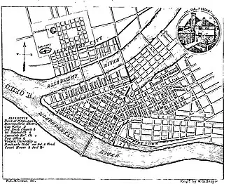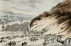 Although the flames were intense, they moved slowly enough that residents had time to remove themselves and many of their belongings. Some fled to the highlands to the east (the modern Hill District), then undeveloped except for the newly built courthouse, an area which remained untouched by the flames.[25] Of those who fled south to the Monongahela River, some were able to cross the Monongahela Bridge (located at the site of the present Smithfield Street Bridge), which connected the city to the southern bank of the river and was the first of what would be many bridges spanning Pittsburgh's rivers. However, this soon became congested, and then the wood-covered structure ignited, being fully consumed in about 15 minutes and leaving nothing but its supporting pylons.[26] Those counting on riverboats to take their belongings away fared less well because the boats that did not flee burned, leaving the refugees to pile their belongings on the riverbank.[22][27] Most of this material was burned by the advancing flames, stolen or looted, while the escaping population was typically left with nothing more than they could carry.[26][28][29] The docks and warehouses on the waterfront were likewise consumed, and as with the residences, attempts to save materials from the warehouses by bringing them to the riverbank only delayed their destruction.[30] The fire followed the river into Pipetown, an area of workers' housing and factories, again spreading destruction.[31] It only halted when the winds died down about 6:00, and by 7:00 it had fully abated within the city, having burned its way to the river and cooler hills. The factories of Pipetown burned on until about 9:00. Throughout the night, there were occasional flare-ups along with the repeated sounds of buildings collapsing.[27][32][33]