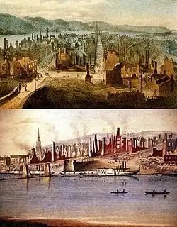 Iron manufacturing had developed in the city, and had come to represent a quarter of its industrial output.[7] The furnaces driving Pittsburgh's iron and glass industries had filled the air with coal dust and soot, as an 1823 observer reported, coating the walls and leaving the men working in the streets "as black as Satan himself,"[8][9] while the British author Charles Dickens had written in 1842 that the city had a "great quantity of smoke hanging over it."[10] Other industries released flour dust and cotton fibers into the air, contributing to a particularly incendiary mix of dust to settle on the city.[11] In addition, the seasonal weather had deprived the city of rain for six weeks, leaving the reservoir "dangerously low," while frequent near-gale-force winds from the west hit the city at mid-day.[12] These conditions left Pittsburgh primed for the disaster that would strike in 1845.
