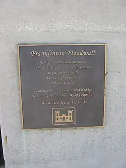 The Great Flood of 1913 severely affected Columbus, Ohio. The area most affected was Franklinton, also known as the Bottoms, for its low elevation near the Scioto River. Among many infrastructure projects, a 7.2-mile floodwall was built from 1993 to 2004 to protect most of Franklinton from flooding.