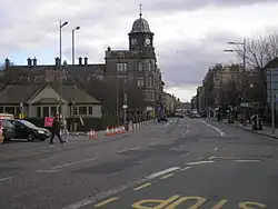 On the south side of the road, Junction Place, shows where a collection of public buildings formerly stood. "Fire Engine House", stepping into the street midway, was a horse-drawn fire service, the gates opening onto the narrowest part of the roadway. At the very end of Junction Place stood Leith Electricity Generating Station, a surprisingly domestic scale building erected in 1895 to provide electric street lights, but having a bronze plaque to explain its creation.[4] On the west side Dr Bell's School designed by R & R Dickson[5] in 1839 operated the Madras System of Education. Behind it, Leith Swimming Baths (now restored) linked to the Public Baths (i.e. rows of enamel baths) and Laundry (both later demolished to create the Victoria Swim Centre. The baths were in use until the late 1970s, due to the high number of Leith dwellings lacking bathrooms up to that time.