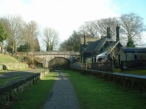 The station building was designed to match the nearby Thornbridge Hall and is Grade II listed;[12] it is now a private residence.[13] The trackbed through the station is part of the 8+1⁄2-mile (13.7 km) Monsal Trail, a shared-use path. Access to the trail can be made at the station site, via the ramp from Longstone Lane.