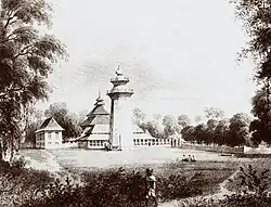 In a typical architecture of Javanese mosque, the Great Mosque of Banten consists of the main prayer hall and a covered veranda (serambi). The serambi is a semi-attached porch-like structure which provides entrance to the main prayer hall. The main prayer features a five-tiered roof supported by four main posts (saka guru). The three uppermost tier is arranged rather uniquely, appearing more like a Chinese pagoda than the regular multi-tiered roof of Javanese architecture. There is a dispute over the original number of the tiers of the main prayer hall; sketches of the city in 1596, 1624, 1661 and 1726 shows the number of the tier as not more than three tiers, while Valentijn (1858) mentioned the number of the tier is five as it is today.[3] The covered verandas were added to the main mosque building, built in the north and south side of the mosque.