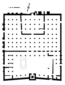 The Mosque's prayer hall is rectangular, measuring 53.20 meters in length and 34.20 meters in width, with thirteen arches and eight pavements.[8][1][21] However, the columns within this hall have vanished, leaving only the foundations intact. It is evident that the ceiling and roof were constructed from wood, as no masonry debris is found on the ground.[6] Within the prayer hall, there is a structure surrounding the mihrab, consisting of five arches and four pavements. This structure, initially thought to be a maqsurah, is now understood to be a small mosque built inside the prayer hall after the Banu Hammad's departure to Béjaïa and the subsequent decline in the population of Qal'at Bani Hammad.[19][14][1][24] The prayer hall itself comprises naves perpendicular to the qibla wall.[16] The five central naves are separated from the rest of the hall by a 1.10-meter-thick wall, currently standing at a height of 0.60 meters.[19][8] All that remains of the mihrab within the prayer hall is its base, truncated on the right side. Its south-facing niche was in the shape of a pointed arch, supported by two freestanding columns. However, only their locations are now discernible.[8]