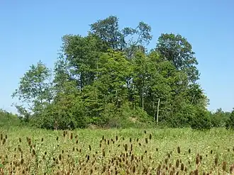 The Great Mound is a massive Native American mound in the southwestern part of the U.S. state of Ohio. Located in Section 19 of Madison Township in Butler County, it has a height of 43 feet (13 m) and a circumference of 511 feet (156 m).[2]: 224 Its total volume is nearly 825,000 cubic feet (23,400 m3),[2]: 224 making it the largest mound in Butler County and one of the largest in southwestern Ohio.[3] Because of the mound's height and its placement on a ridgeline, an individual at the summit can see for a great distance. In the late nineteenth century, it was theorized that mounds such as the Great Mound were built as observation or watch points, and that the builders maintained the ability to light fires atop the mounds as a method of communicating across wide distances.[2]: 225 The potential of these mounds for long-distance communication was demonstrated in 1990 by three groups of volunteers. After climbing the Great Mound, the first group established visual contact with the Hill-Kinder Mound in Franklin (more than 11 miles (18 km) to the northeast[4]), from which point the observers of the second group contacted the third group atop the Miamisburg Mound near Dayton.[5]
