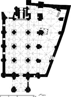 When the building was transformed from a church into a mosque, most of the previous Crusader construction was completely replaced, but the mosque's facade with its arched western entrance is a typical piece of Crusader ecclesiastical architecture,[39] and columns within the mosque compound still retain their Italian Gothic style. One of the columns was reused from an ancient synagogue.[40]