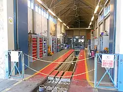 Halfway stop is also the location of the engineering depot, with access for trams from both upper and lower sections. Engineers have depot facilities for inspection and maintenance of the trams, including inspection pits.[1]: 10 Although there is no public access to the depot, some parts of both the depot and the control room can be viewed by passengers through internal glazing in the viewing area, whilst interchanging between upper and lower sections.[1]: 5