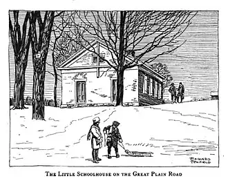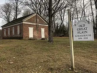 Built in 1856, the Greek Revival one-room schoolhouse served the students of the Great Plain community until the 1940s. In 1954 the City of Danbury transferred the building to the Great Plain District Association, a neighborhood organization with plans to convert it into a community center. In February 1955, 75 residents from the neighborhood joined in a housewarming for its opening.[8] The Old Great Plain School is one of only three one-room schoolhouses still standing in Danbury.[6]