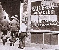 With the conductors, engineers, firemen, and brakemen who actually operated the trains unaffected by the strike, the railroad companies immediately began to replace the skilled and semi-skilled maintenance workers with strikebreakers. In unison, railroads began to establish living facilities for the strikebreakers inside their railway shops and in railroad cars and railroad guards were hired to protect property and defend strikebreakers.[3] Commissaries and kitchens were established to provide for newly-hired workers, and newspaper advertising was published by a number of railway companies in an attempt to win public support for their strikebreaking efforts.[6]