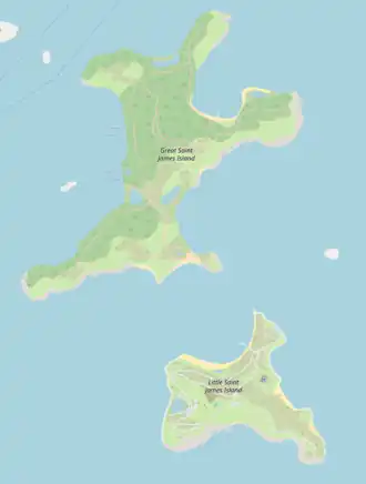 Great Saint James is a private island in the United States Virgin Islands, located off the east end of St. Thomas and belonging to subdistrict East End, Saint Thomas. The island is approximately 165 acres (67 ha) in size,[1] and is located 0.4 kilometres (0.25 mi) southeast of Saint Thomas.[2] The island was most notably owned by financier and sex offender Jeffrey Epstein, along with the neighboring Little Saint James island.