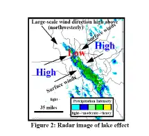 Great Salt Lake enhanced precipitation occurs when a strong, cold, northwesterly wind blows across a relatively warm lake. This is common after a cold front passage, where the winds are predominantly northwesterly and the air is much colder than the lake.[1] When the land-lake breeze blows towards the lake, there is a convergence zone that acts to channel the cold air over the center of the lake and further enhance precipitation. The salinity of the Great Salt Lake prevents freezing but reduces the saturation vapor pressure and latent heat flux into the overlying air. As a result, minimal amounts of moisture and latent heat are added to the air moving over the lake. The high relief of the Wasatch mountains further capitalizes on lake enhancement and can receive multiple feet of snow from lake-effect alone.[1][2]