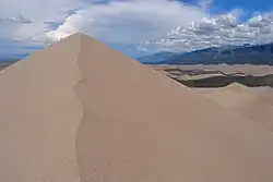 The park contains the tallest sand dunes in North America, up to 750 feet (230 m) tall.[6][7] The dunes cover an area of about 30 sq mi (78 km2) and are estimated to contain over 1.2 cubic miles (5 billion cubic metres) of sand.[8] Sediments from the surrounding mountains filled the valley over geologic time periods. After lakes within the valley receded, exposed sand was blown by the predominant southwest winds toward the Sangre de Cristos, eventually forming the dune field over an estimated tens of thousands of years.[9] The four primary components of the Great Sand Dunes system are the mountain watershed, the dune field, the sand sheet, and the sabkha.[8] Ecosystems within the mountain watershed include alpine tundra, subalpine forests, montane woodlands, and riparian zones.[10]