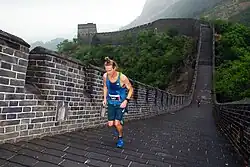 The Great Wall Marathon is an annual marathon race, traditionally held on the third Saturday of May[1] along and on the Huangyaguan or Huangya Pass (simplified Chinese: 黄崖关; traditional Chinese: 黃崖關; pinyin: Huángyáguān; lit. 'Yellow Cliff Pass'), Tianjin section of the Great Wall of China, East of Beijing.[2][3] Since it first started in 1999, the race has grown to several hundred participants. A locally organized event offering a full selection of runs including a full marathon (42.2k), half marathon (21.1k), 10k, and 5k distances. Aside from the main marathon, a half marathon, 10 km and 5 km runs were also held until 2012. 2013 marked the debut of an 8.5 km "fun run", replacing the 5 and 10 km distances. The course is much tougher than traditional marathons with participants challenged by 5,164 stone steps and many steep ascents and descents.[4]