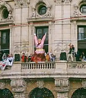 The chupinera or txupinera is responsible for launching the rocket that announces the beginning of the festival from the balcony of the Teatro Arriaga. Each year, she is chosen from the female members of the festival troupe that has been elected in a draw organized by the Coordination of Comparsas, which does not consider the troupes already favored in previous years. The txupinera is accompanied in the balcony by the pregonero or herald, a prominent figure from or associated with Bilbao who reads the festival proclamation.