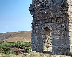 Great Wheal Charlotte, also known as Wheal Charlotte, is an abandoned copper and tin mine lying between St Agnes and Porthtowan in Cornwall, England. All that is left of the mine now is the wall and door arch of an engine house and an adjacent fenced-off mine shaft. The surviving wall is surrounded by rock debris and the extensive remains of spoil tips, mostly of bare rock fragments crisscrossed by paths that link the South West Coast Path with surrounding land owned by the National Trust.[1] Predominantly a copper producer,[2] in its heyday, in the 1830s, the mine extracted ore containing 7.25% copper. It may have partially closed around 1840.[3] However, ore production was high in this year, and records of output extend at least to 1856, and possibly to 1863.[4]