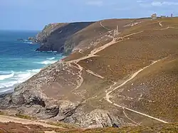 In addition to Great Wheal Charlotte, Wheal Coates mine lies directly to the north of Chapel Porth, with its own car park a little inland from the cove.[13] The site of North Towan mine, an early nineteenth century copper mine which was later worked as New Wheal Charlotte and then Charlotte United, lies 0.5 km (0.31 mi) inland from Great Wheal Charlotte, its later engine house still standing. All are connected by National Trust paths. North Towan mine employed twelve people in 1837.[7]