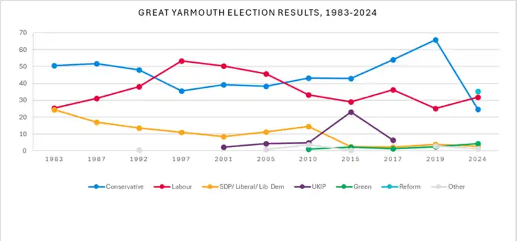 Great Yarmouth is a constituency in Norfolk represented in the House of Commons of the UK Parliament since 2024 by Rupert Lowe. Elected for Reform UK, Lowe had the whip suspended in March 2025 following allegations of bullying and allegations of threats of physical violence against Reform UK party chairman Zia Yusuf. He now sits an Independent.[2]