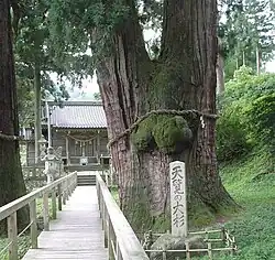 The tree stands 54.8 metres (180 ft) tall. At the base, it measures 11.5 metres (38 ft) in circumference and 3.41 metres (11.2 ft) across. At chest height, it is 9.6 metres (31 ft) around and 3.0 metres (9.8 ft) across. The tree splits into two trunks 4.9 metres (16 ft) above ground level. In 1928, Professor Manabu Miyoshi of Tokyo Imperial University estimated the age of the tree to be 2,300 years. The other three trees are 8.8 metres (29 ft), 6.65 metres (21.8 ft) and 7.8 metres (26 ft) at chest height and natural monument of Ishikawa Prefecture. These four trees are deemed artificially planted by human due to each tree position formed corner of rectangle, and Jōmon pottery excavated from field hill adjacent to shrine.[1]