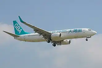 Greater Bay Airlines Company Limited (GBA), commonly known as Greater Bay Airlines (Chinese: 大灣區航空有限公司), is a Hong Kong–based carrier established in 2020.[6] The company's inaugural passenger flight (from Hong Kong to Bangkok) was conducted in July 2022.[1]