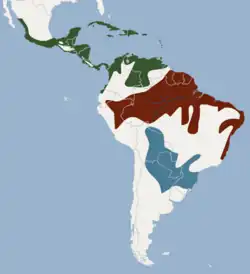 The greater bulldog bat's range stretches from Mexico to Northern Argentina and also includes most Caribbean islands.[7] While vast, its range is also patchy as the bat is limited to mostly well-watered lowland and coastal areas as well as river basins. There is geographical variation in the species and are classified as subspecies. Bats around the Caribbean Basin are large and usually have the pale mid-dorsal stripe, despite varying in pelage.[9] These bats are known as N. l. mastivus. In Guianas and the Amazon Basin, the bats are small and dark and often lack the pale mid-dorsal stripe.[9] These bats are known as N. l. leporinus. In eastern Bolivia, southern Brazil and northern Argentina bats tend to be large and pale, more so than the other subspecies.[9] They are known as N. l. rufenscenes.