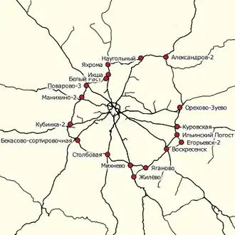 The Greater Ring of the Moscow Railway (Russian: Большое кольцо Московской железной дороги) is the common name for a system of connector lines between the railways that radiate from Moscow. The general configuration of the Greater Ring is a ring around the main part of Moscow (outside Moscow).[1] It forms part of the radial-ring structure of the Moscow railways. The Greater Ring crosses the rail lines in all 11 radial directions from the railway stations of Moscow. It totals 584 kilometres (363 mi) in length. For its entire length, the ring is equipped with an automatic locking system, permitting, where necessary, two-way single-track operation; elsewhere, there are two track and multiple track sections.[2]