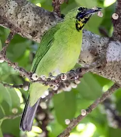 The greater green leafbird (Chloropsis sonnerati) is a species of bird in the family Chloropseidae. It is distinguished from the lesser green leafbird (Chloropsis cyanopogon) by its powerful beak, yellow throat and eye ring of the female; and lack of a yellow border along the black throat patch found in the male C. cyanopogan.