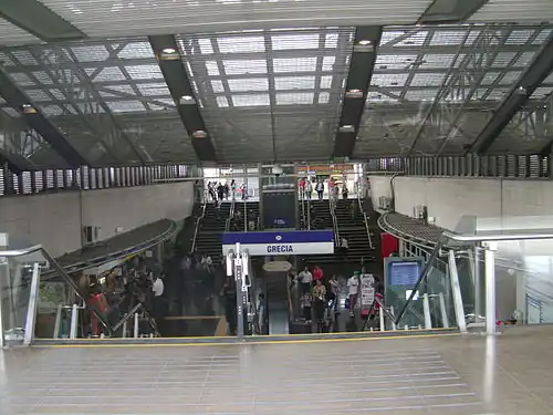 Grecia is an underground metro station on Line 4 of the Santiago Metro, in Santiago, Chile. The station features a steel-framed skylight. The northernmost portion of the tracks and platforms are laterally curved, which is a distinctive feature of this station.
