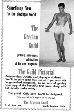 Grecian Guild Pictorial was an American physique magazine published from 1955 until 1968. While ostensibly dedicated to art, health, and exercise, like other physique magazines of the time, it was understood that, in practice, its homoerotic photography and illustrations were almost exclusively created by and for gay men. It differed from other physique magazines in its focus on themes and imagery from Ancient Greece, which was seen by many as a coded reference to homosexuality. It has been described as one of the "gayer" of the physique magazines.[2]