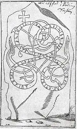 About 3,000 runestones from the Viking Age have been discovered in Scandinavia of which c. 2,700 were raised within what today is Sweden.[13] As many as 1,277 of them were raised in the province of Uppland alone.[14] The Viking Age coincided with the Christianisation of Scandinavia, and in many districts c. 50% of the stone inscriptions have traces of Christianity. In Uppland, c. 70% of the inscriptions are explicitly Christian, which is shown by engraved crosses or added Christian prayers, while only a few runestones are explicitly pagan.[15] The runestone tradition probably died out before 1100, and at the latest by 1125.[14]