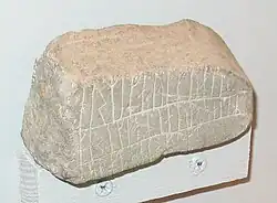 Runestone U 104 (original location) is in red sandstone measuring 1.35 m (4 ft 5 in) in height and 1.15 m (3 ft 9 in) in width.[36] It was first documented by Johannes Bureus in 1594.[36] It was donated as one of a pair (the other is U 1160[28]) to the Ashmolean Museum in Oxford in 1687 upon the request of king James II of England to king Charles XI of Sweden asking for two runestones to add to the Oxford University collection.[37] It is in the Urnes (Pr5) style. It was raised by Þorsteinn in memory of his father Sveinn and his brother Þórir, both of whom went to Greece, and lastly in memory of his mother. The stone is signed by the runemaster Öpir whose Old Norse is notable for its unorthodox use of the haglaz rune (ᚼ), as in hut for Old Norse út ("out").[38] The erratic use of the h-phoneme is a dialect trait that has survived and is still characteristic for the modern Swedish dialect of Roslagen, one of the regions where Öpir was active.[38]