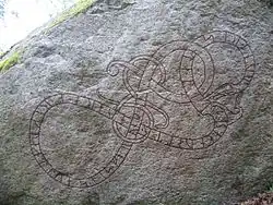 About 3,000 runestones from the Viking Age have been discovered in Scandinavia of which c. 2,700 were raised within what today is Sweden.[13] As many as 1,277 of them were raised in the province of Uppland alone.[14] The Viking Age coincided with the Christianisation of Scandinavia, and in many districts c. 50% of the stone inscriptions have traces of Christianity. In Uppland, c. 70% of the inscriptions are explicitly Christian, which is shown by engraved crosses or added Christian prayers, while only a few runestones are explicitly pagan.[15] The runestone tradition probably died out before 1100, and at the latest by 1125.[14]