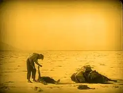 The oppressive heat slows McTeague's progress. Schouler's progress is also beginning to wane when he spies McTeague and moves in to arrest him. After a confrontation, McTeague's horse bolts and Schouler shoots it, puncturing the water container. The water spills onto the desert floor. The pair fight one last time, with McTeague proving the victor but Schouler has handcuffed himself to McTeague. Finally, McTeague is left in the desert with no horse and no water, handcuffed to a corpse and unable to reach the remaining money.
