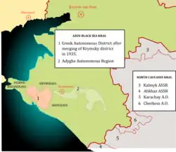 Greek Autonomous District (Russian: Греческий автономный район, romanized: Grechesky avtonomnyy rayon, Greek: Ελληνική Αυτόνομη Επαρχία, romanized: Ellēnikḗ Aftónomē Eparchía) was a national district created according to the policy national delimitation in the Soviet Union. It was established on 27 February 1930 by the decree of the Azov-Black Sea Krai ispolkom, with the capital in stanitsa Krymskaya (now the town of Krymsk). In 1932 the capital was moved to stanitsa Nizhne-Bakanskaya. It was the only one district of republican subordination (i.e., subordinated directly to a Soviet republic, rather than to an intermediate-level administrative entity). This Greek autonomy in the Soviet Union existed until 6 March 1939, when it was disbanded and the administrative entity renamed to Krymsky District by the decree of Krasnodar Krai kraikom of the All-Russian Communist Party,[1] by the end of the first wave of the Soviet repression against ethnic Greeks.