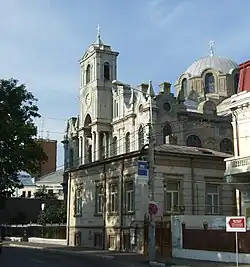 In 1863, the local Greek community decided to build a church, with services in Greek. It would serve both the Greek inhabitants of the city and the Greeks who arrived from abroad in the Port of Brăila. The architect was Avraam Ioanidis of Bursa. He also supervised construction, largely executed by Italian workers. The church is cruciform, with two spires. The dominant architectural style is Byzantine Revival, with Greek, Gothic and Renaissance Revival touches. It was completed in 1872.[1] Bishop Melchisedec Ștefănescu consecrated it the same year.[2]