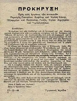 On 1 December 1944, the Greek "National Unity" government of Papandreou announced an ultimatum for the general disarmament by 10 December of all guerrilla forces, excluding the tactical forces (the III Greek Mountain Brigade and the Sacred Band);[24] and also a part of EDES and ELAS that would be used, if it was necessary, in Allied operations in Crete and Dodecanese against the remaining German Army units. The EAM called for a general strike and announced the reorganization of the Central Committee of ELAS. A demonstration, forbidden by the government, was organised by EAM on 3 December.
