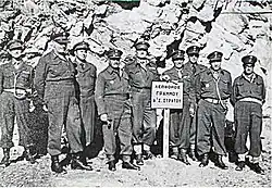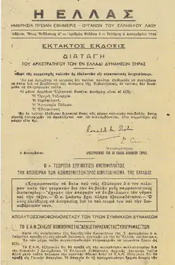 By the summer of 1944, it was obvious that the Germans would soon withdraw from Greece, as Soviet forces were advancing into Romania and towards Yugoslavia, threatening to cut off the retreating Germans. The government-in-exile, now led by prominent liberal Georgios Papandreou, moved to Italy, in preparation for its return to Greece. Under the Caserta Agreement of September 1944, all resistance forces in Greece were placed under the command of a British officer, General Ronald Scobie.[22] The Western Allies arrived in Greece in October, by which time the Germans were in full retreat and most of Greece's territory had already been liberated by Greek partisans. On October 13, British troops entered Athens, the only area still occupied by the Germans, and Papandreou and his ministers followed six days later.[23]