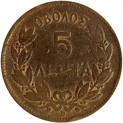 In modern Greece, lepton (modern form: lepto, λεπτό) is the name of the 1⁄100 denomination of all the official currencies of the Greek state: the phoenix (1827–1832), the drachma (1832–2001) and the euro (2002–current) – the name is the Greek form of "cent". Its unofficial currency sign is Λ (lambda).[1] Since the late 1870s, and until the introduction of the euro in 2001, no Greek coin had been minted with a denomination lower than 5 lepta.