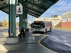 Passengers at the Transportation Center benefit from a staffed information counter, real-time bus arrival board, automated pass dispenser, spacious climate-controlled seated waiting area, vending machines, and public restrooms. Outside, a large canopy covering many bus stalls protects passengers from falling rain and snow. In addition, each bus route has a designated stall, and the distance passengers have to walk between buses is minimal. Special public hearings and informational meetings are also held at the Transportation Center. At the heart of the facility stands a 300-foot long canopy with 14-foot vertical clearance for bus traffic and a width sufficient for protecting the passengers from sun and rain. The concrete island has a smooth saw-tooth form for buses to enter and exit without backing up. The access to this platform is centralized at one crosswalk, which minimizes all cross traffic between passengers and buses.[10][11]
